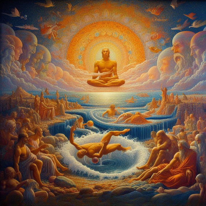 Je propose une « clé » de « décodage », en fait, ma « clé ». J’imagine ma vie comme un cours d’eau, fluide et ininterrompu. Les identifications, les attachements, les quêtes, sont comme des tourbillons et des remous dans cette rivière. M’identifier au rien, c’est comme plonger dans le flux sans résistance, me laissant porter par la fluidité de l’existence. Si je m’attache au vide, c’est reconnaître la nature éphémère des formes, être conscient que même le vide virevolte dans le grand ballet de l’Existence.