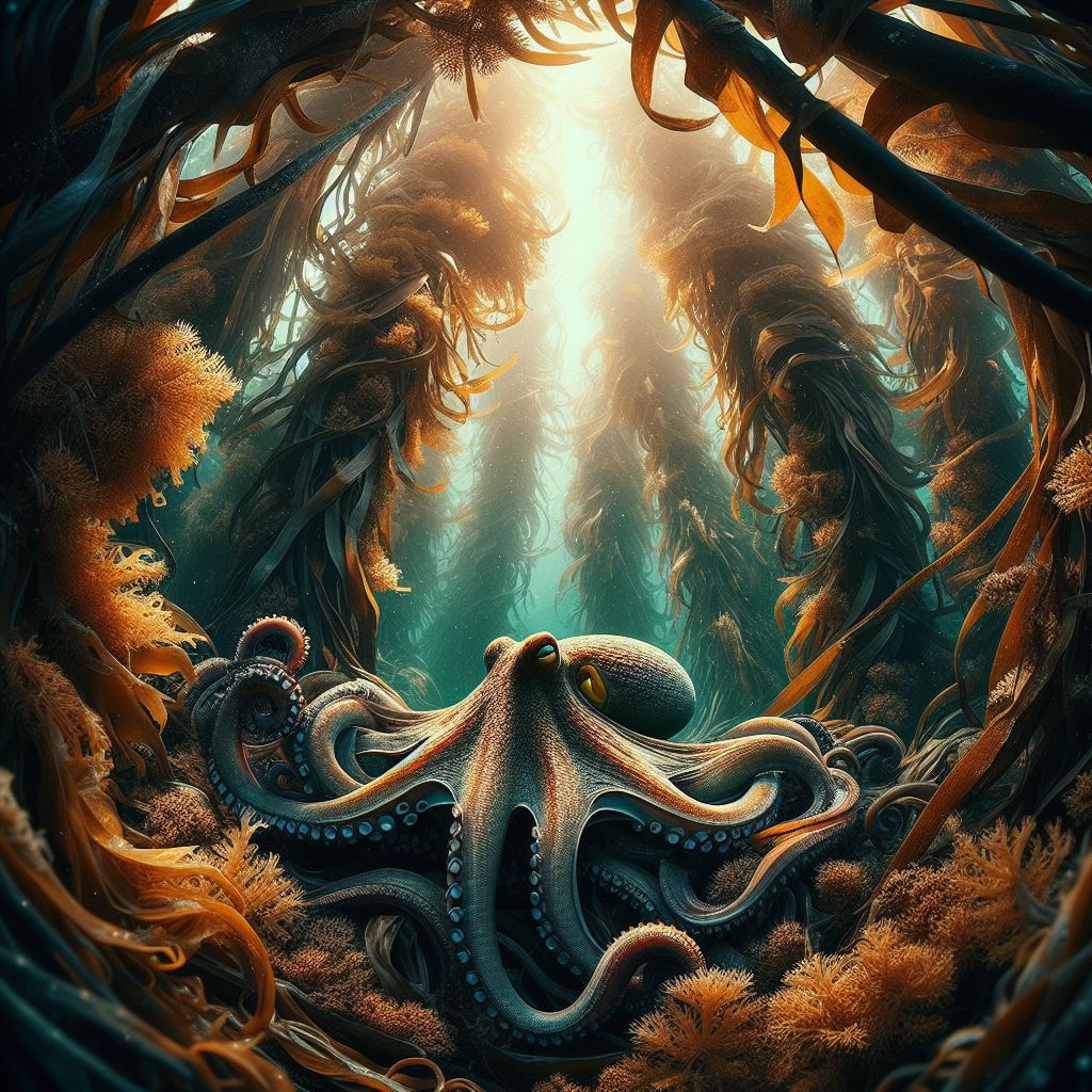 Dans les profondeurs insoupçonnées de cette forêt où la lumière du soleil peine à atteindre ne serait-ce qu’une fraction de sa splendeur, j’ai trouvé une inspiration inattendue. C’est ici dans ces abysses salins que j’ai rencontré cette pieuvre. Une créature qui défie les conventions de l’intelligence animale. Loin des regards terrestres, cette pieuvre évolue dans un royaume éthéré où chaque mouvement de ses tentacules dépasse le simple ballet des créatures marines.