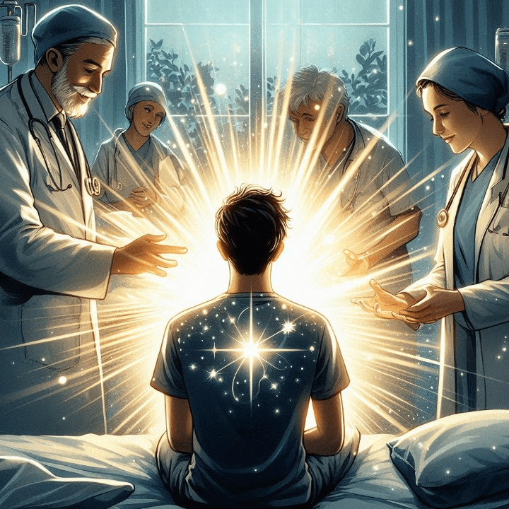 Les médecins et les infirmières furent stupéfaits par les progrès de Aurélien. Sa santé s’améliorait de jour en jour. Un pas après l’autre, une respiration après l’autre. Ils ne pouvaient expliquer ce miracle mais ils devaient se rendre à l’évidence. Aurélien savait qu’il s’était passé quelque chose mais il n’avait pas la moindre idée qu’une étoile était entrée en lui. C’était un secret entre elle et lui.