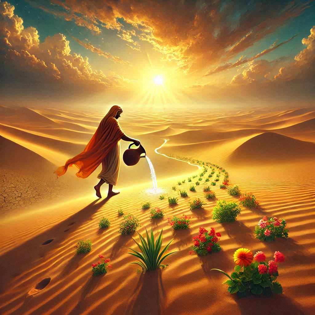 Un jour, j’ai été marqué par une parabole. Il s’agit de l’histoire d’un pèlerin qui traverse un désert. Ce pèlerin porte un vase d’eau et, chaque jour, il verse une partie de cette eau dans le sable aride. Au début, il se plaint, il geint, il se lamente. Chaque goutte semble se perdre et sa peur de manquer grandit. Mais à mesure que le temps s’écoule, il commence à remarquer quelque chose d’étonnant. Les endroits, où il a versé l’eau, commencent à fleurir. Des herbes poussent, des fleurs éclatent. Le désert se transforme, peu à peu, en un jardin luxurieux.